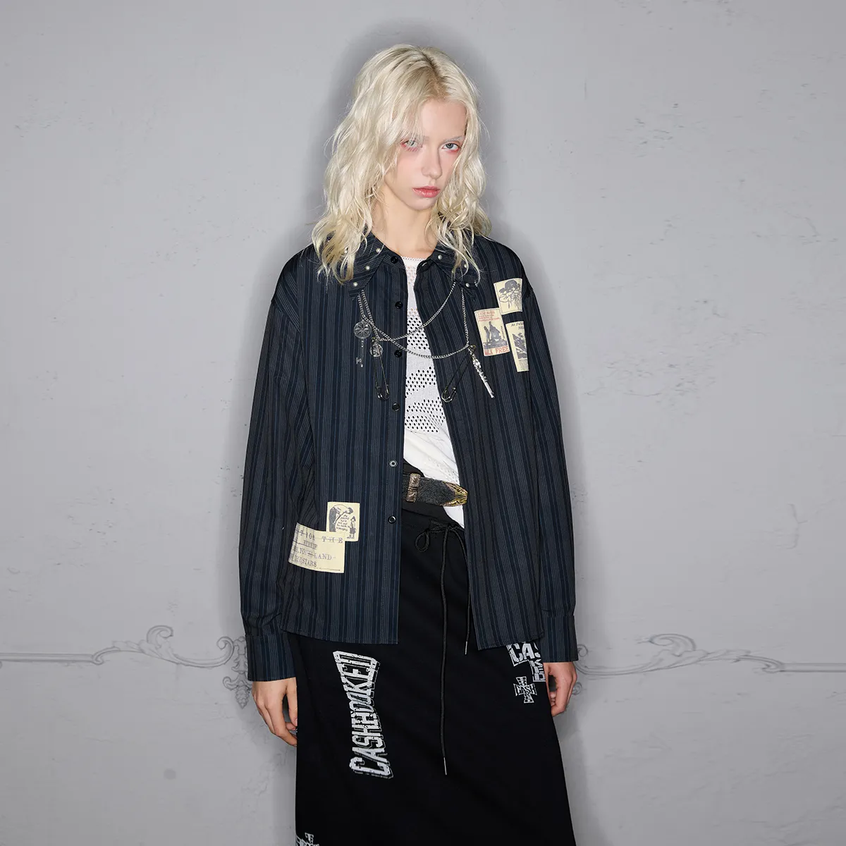 American street style long-sleeve shirt with fun patches, contrasting color stripes, collar, and rivets